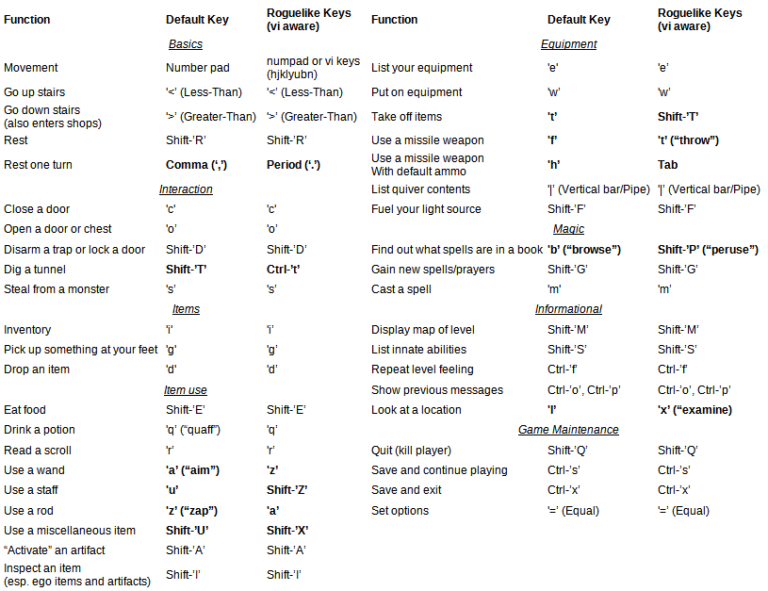 - Roguelike Keyset ควบคุมทิศทางด้วย hjklyubn โดยที่ h, j, k, l (ซ้าย, ล่าง, บน, ขวา) y, u, b, n (เฉียงซ้ายบน, เฉียงขวาบน, เฉียงซ้ายล่าง, เฉียงขวาล่าง) ชุดนี้คือแบบดั้งเดิม หรือที่เรียกกันว่า Vi-key สามารถเดินเฉียงได้สะดวกกว่าเหมือนพิมพ์สัมผัส ส่วนตัวแนะนำให้ใช้ชุดควบคุมนี้ครับ